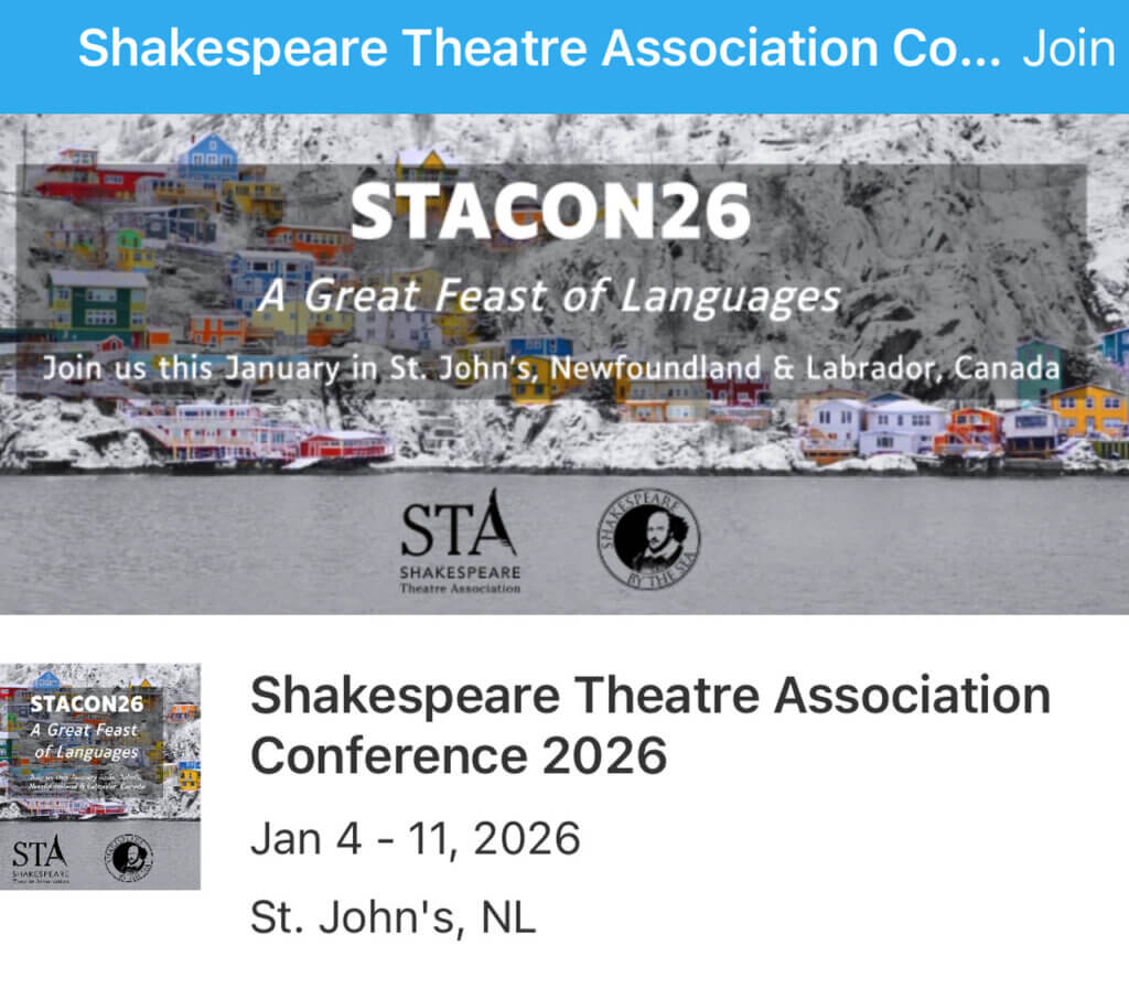 Los directores de la Fundación Shakespeare Argentina (FSA) fueron invitados a participar en la Conferencia Internacional de la Shakespeare Theatre Association (STA) que se desarrolló en la ciudad de St John, Newfoundland & Labrador en Canadá, desde el 4 al 11 de enero de 2026, organizada por la compañía canadiense Shakespeare by the Sea.
